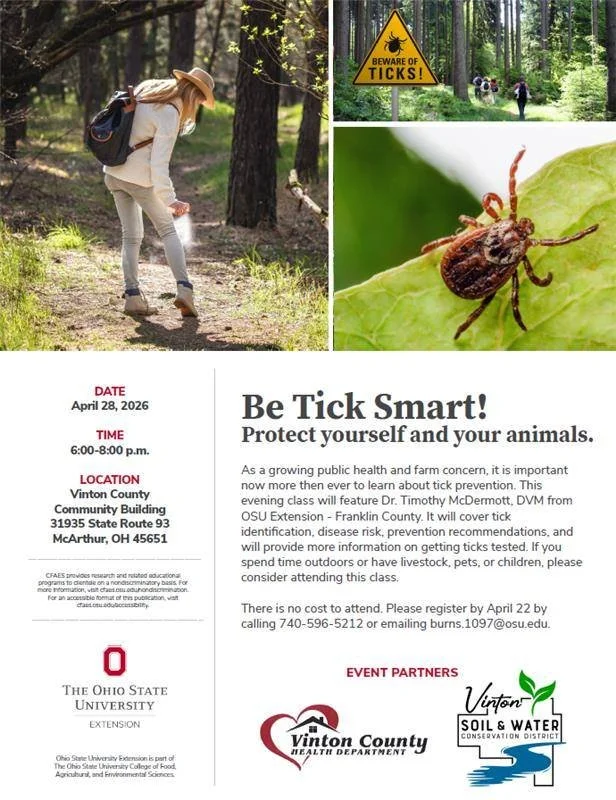 As a growing public health and farm concern, it is important now more then ever to learn about tick prevention. This evening class will feature Dr. Timothy McDermott, DVM from OSU Extension - Franklin County. It will cover tick identification, disease risk, prevention recommendations, and will provide more information on getting ticks tested. If you spend time outdoors or have livestock, pets, or children, please consider attending this class.