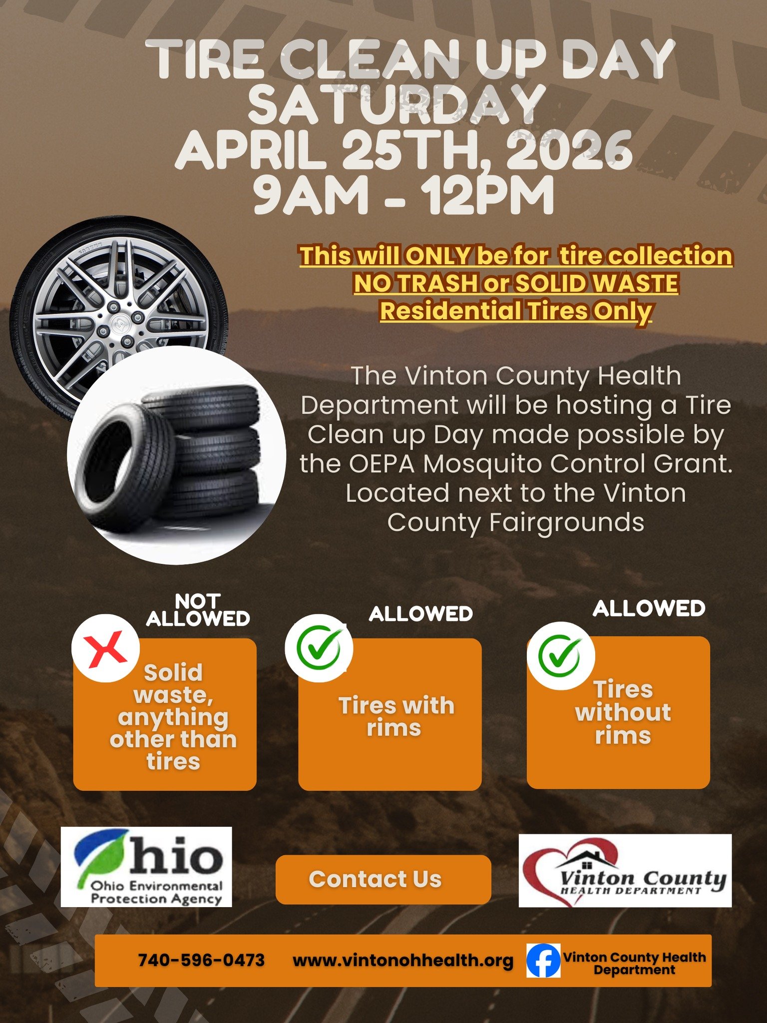 The Vinton County Health Department will be hosting a Tire Clean Up Day made possible by the OEPA Mosquito Control Grant.